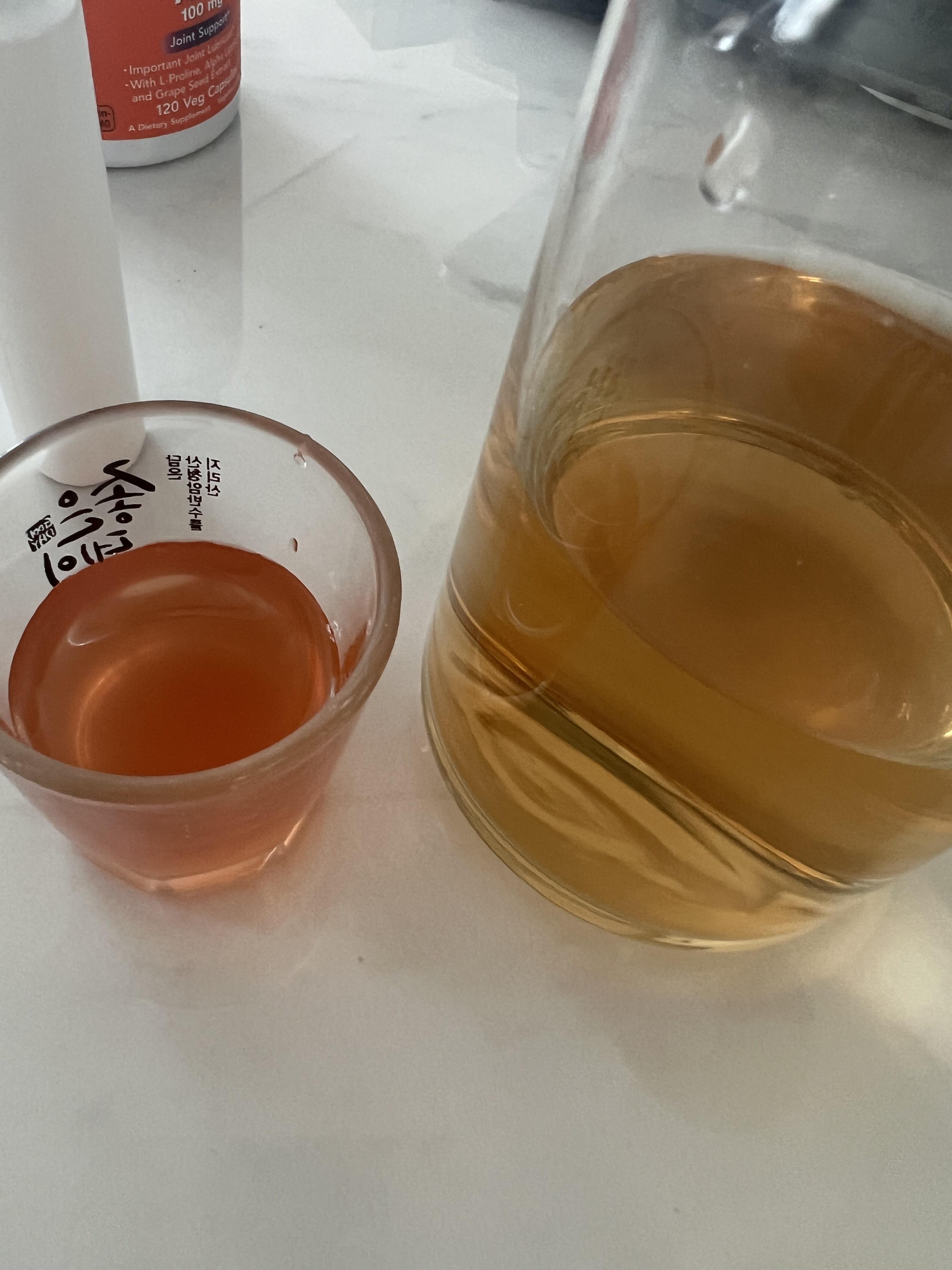 보리차와 색을 비교해 보았습니다. 오른쪽이 보리차, 왼쪽 작은 소주잔(ㅎㅎㅎㅎ 작고 투명한 잔이... 이것밖에 없네요)이 바로 순백샷입니다. 맑고 반투명한 묽은 액체입니다. 향도 향긋한 편이라 음용이 어렵지 않아서 좋았어요.