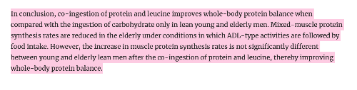 결론적으로, 단백질과 류신의 동시 섭취는 날씬한 청년과 노인의 탄수화물 섭취에 비해 전신 단백질 균형을 향상합니다. ADL 유형의 활동에 음식 섭취가 뒤따르는 조건 하에서 노인의 혼합 근육 단백질 합성률은 감소합니다. 그러나 단백질과 류신을 함께 섭취한 후 근육 단백질 합성률의 증가는 젊은 날씬한 남성과 나이 든 날씬한 남성 사이에 큰 차이가 없어 전신 단백질 균형이 개선되었습니다.