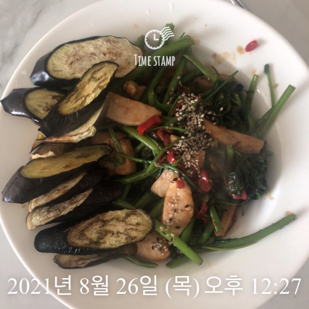 그나저나 아침메뉴는 에프에 돌린 가지와 모닝글로리 닭찌 볶음. 간식으로 쌀식빵 한장