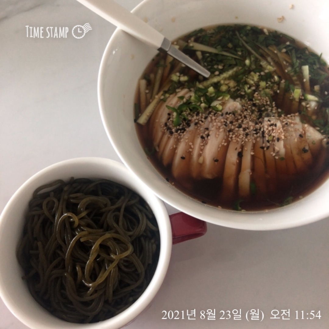 잇메이트 닭가슴살과 오이 1개를 썰어서 쯔유 와사비 에리스리톨을 좀 넣고 모밀국수처럼 해서 먹었어요.