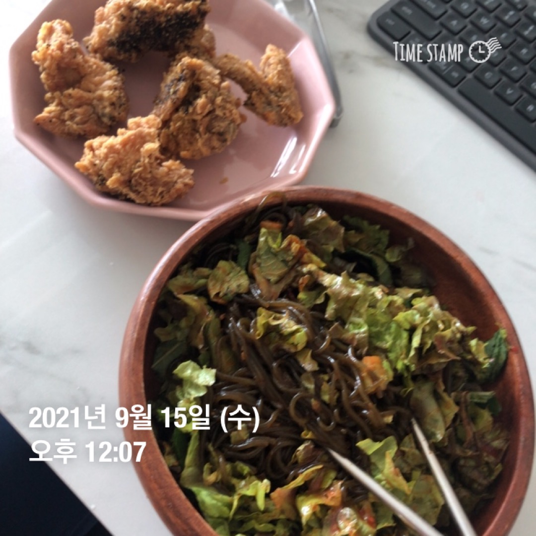 | 12시 | 점심 어제먹고 남은 치킨 (치킨에 미려니 남았그나..) + 해초 누들 + 야채 가득 치킨 먹을까말까 엄청 망설였는데, 역시 나는 아직 세속의 맛을 버릴 준비가 되지 않았다... |