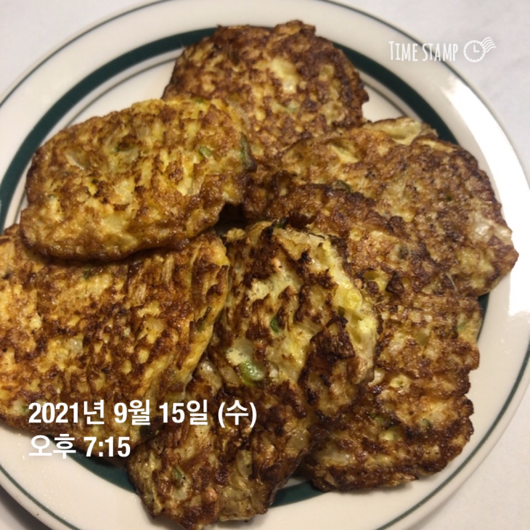 | 7시 | 저녁 팽이버섯 달걀 양파 배추 전 (ㅎㅎ 찜을 해먹지...) 저녁시간도 조금 늦음. 6시 전에 먹는 것을 습관을 들여봅시다. |