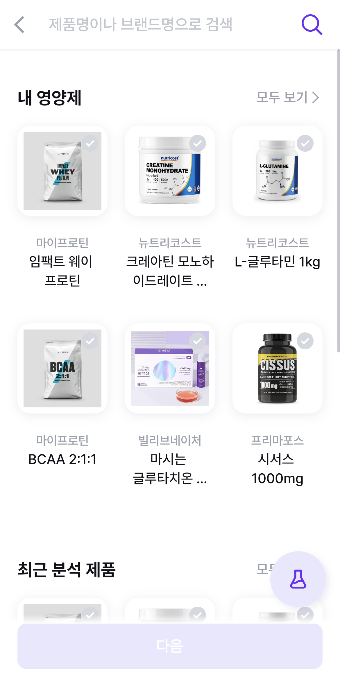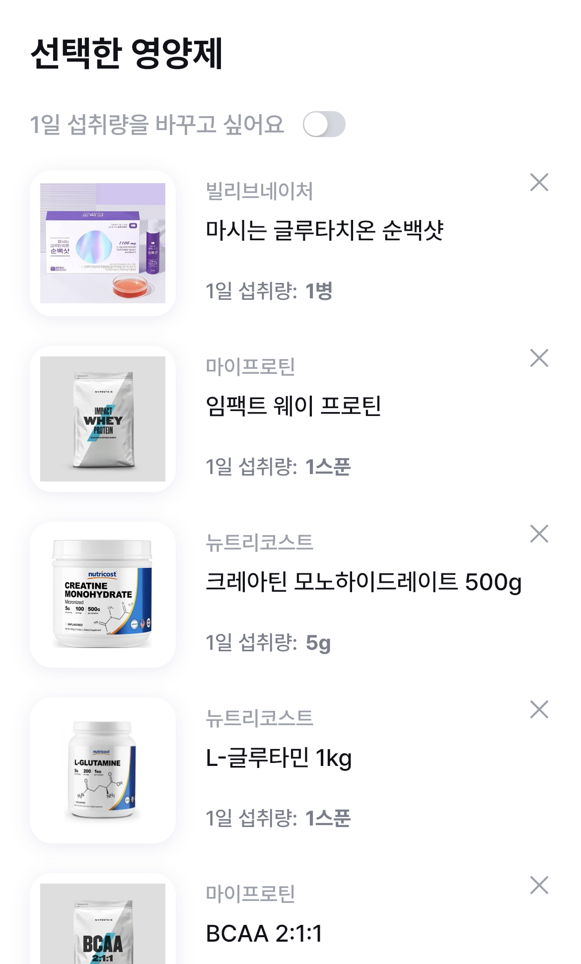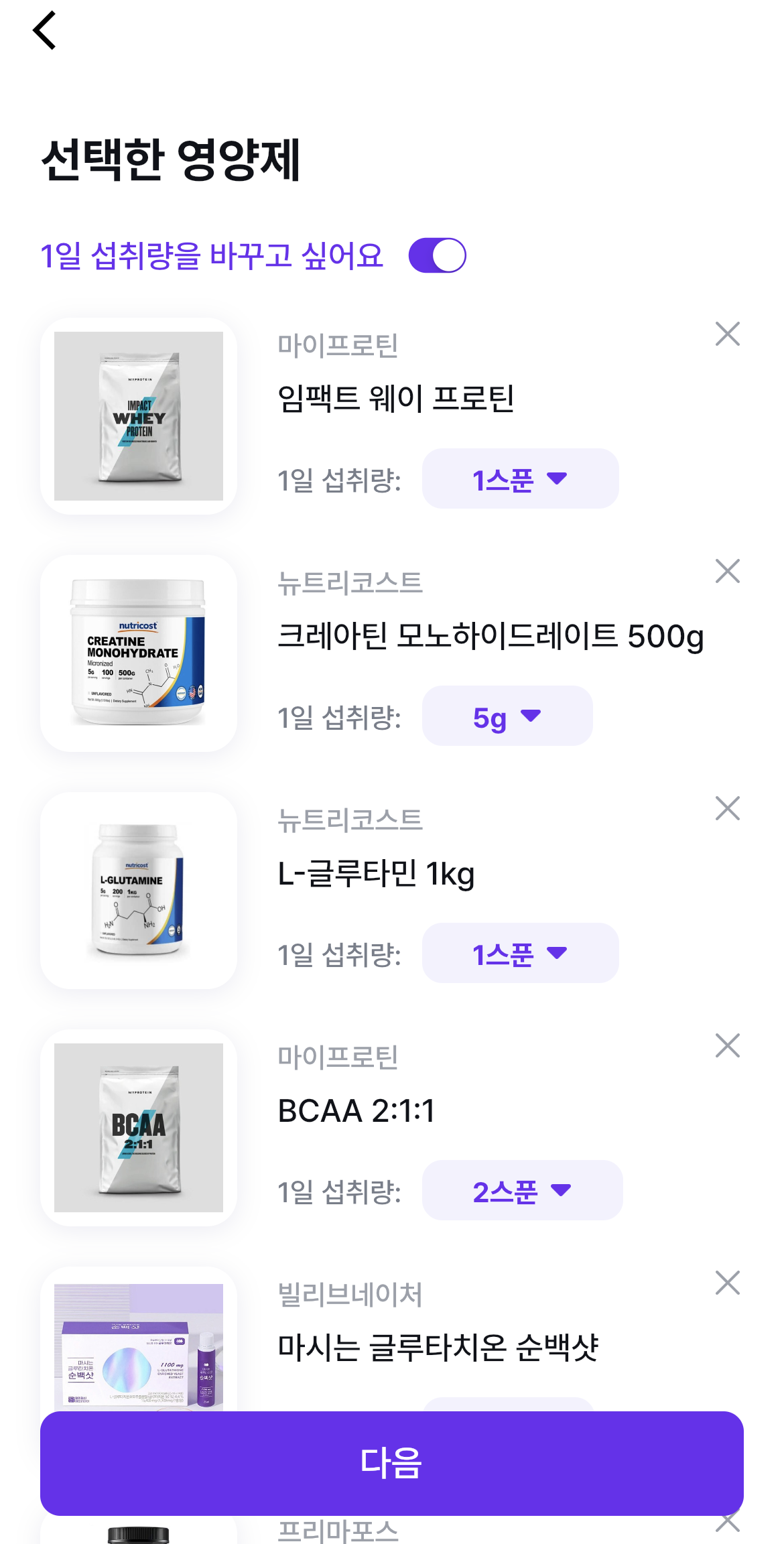 섭취하고 있는 모든 영양제가 추가가 완료되면 다시 한번 오른쪽 하단의 아이콘을 눌러주시면 선택한 모든 영양제가 나오고, 1일 섭취량이 자동으로 입력되어 있는 것을 볼 수 있습니다. 하지만 왼쪽 상단에 1일 섭취량을 바꾸고 싶어요를 오른쪽으로 켜면 모든 영양제의 1일 섭취량을 원하는 만큼 바꿀 수 있습니다. 1일 섭취량 조절까지 모두 끝났다면 하단에 "다음"을 눌러 다음 단계로 이동합니다.