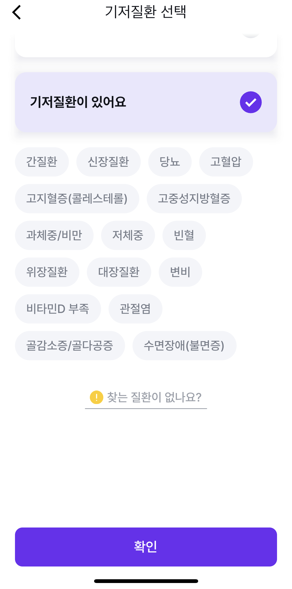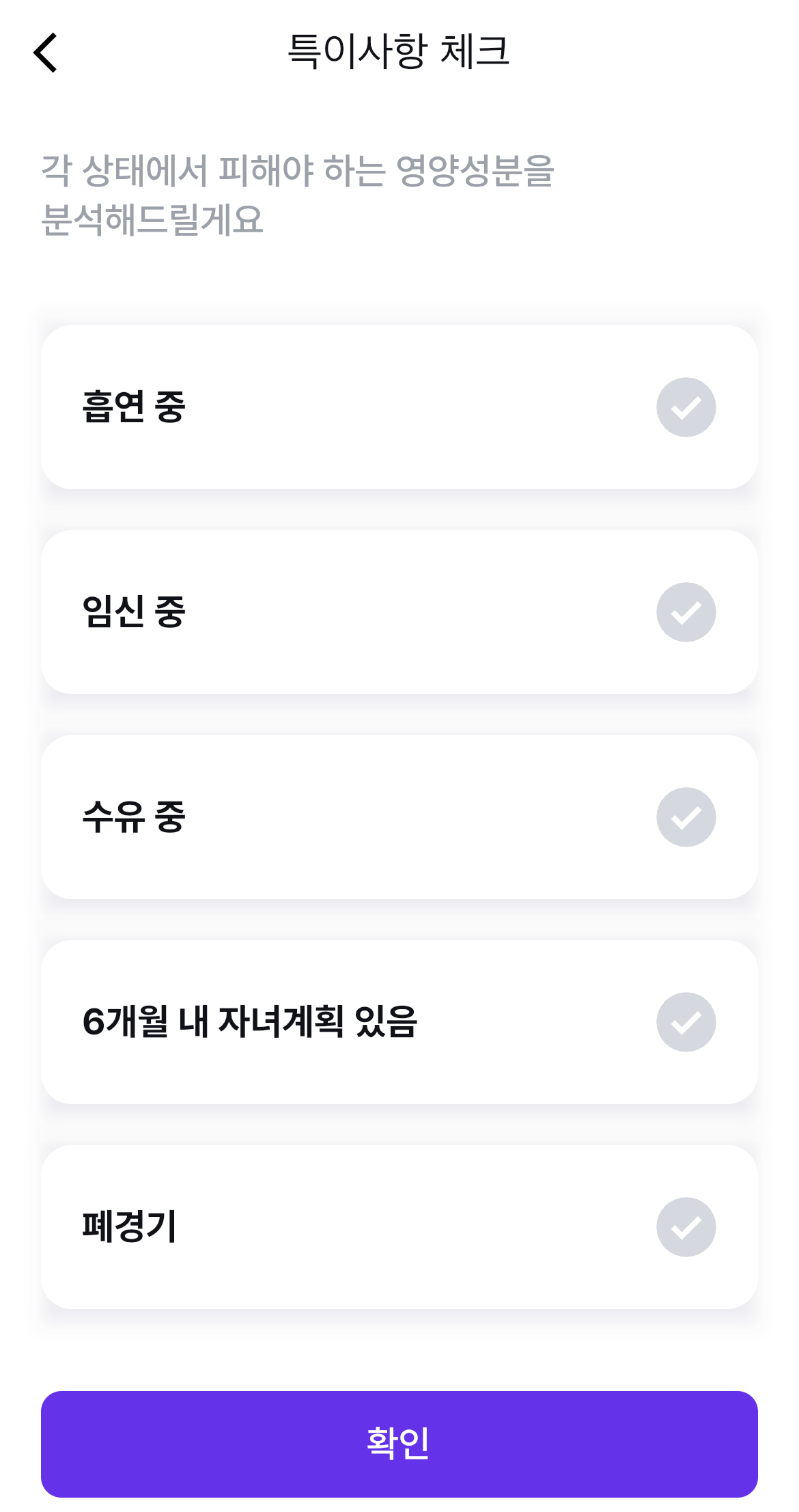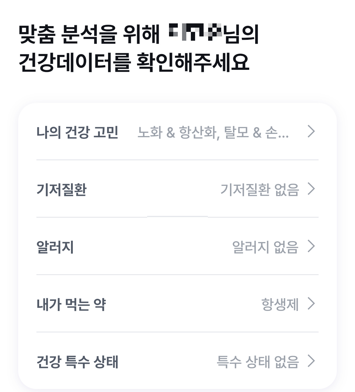 이제 여기서 제대로 자신에게 맞춤 분석을 할 수 있도록 건강 고민이나 기저질환, 등등을 체크해줄 수 있습니다.