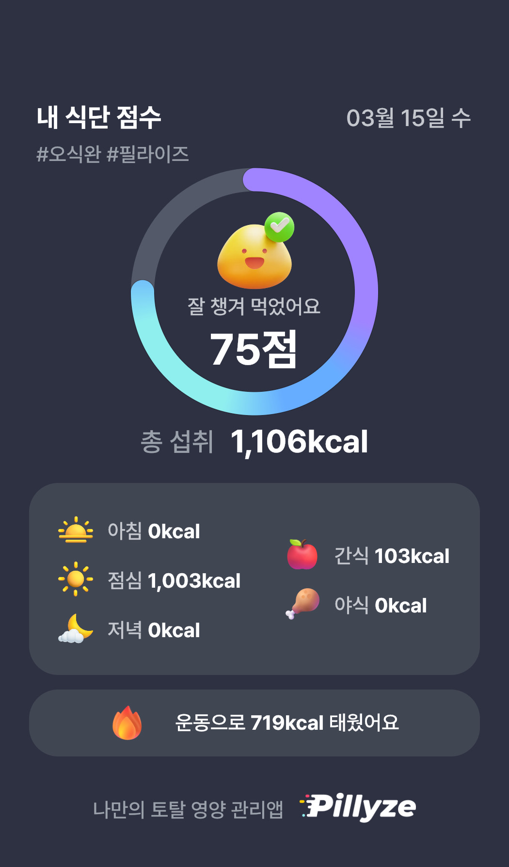 최근 필라이즈 앱에는 관리 기능이 더 추가되어서 더욱 더 완벽하게 건강을 관리할 수 있는 앱으로 거듭나고 있습니다. 사용하고 있는 건강 앱이나 워치 등이 있다면 연동해서 데이터를 자동으로 입력이 가능하고, 그에 따라 목표를 수립하고 맞춤 식단을 제공합니다. 식단의 경우 음식을 추천한다기보다는, 영양소의 비율을 추천해 주고, 자신이 먹은 음식을 입력하면, 기준에 따라 섭취를 제대로 하고 있는지를 알려주는 것이죠. 또한 운동량까지 더해서 하루의 점수도 매겨줍니다. 더 높은 점수를 받고 싶은 의지가 타오르는 느낌이 듭니다.