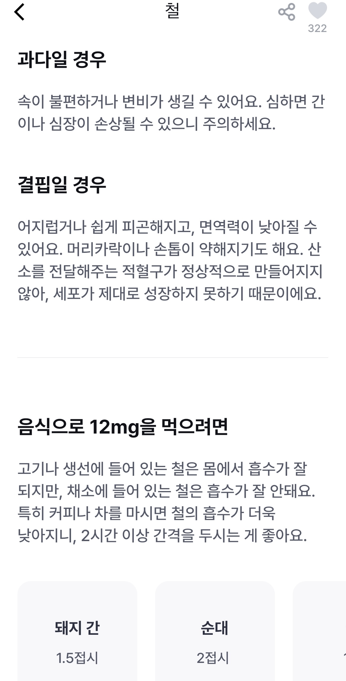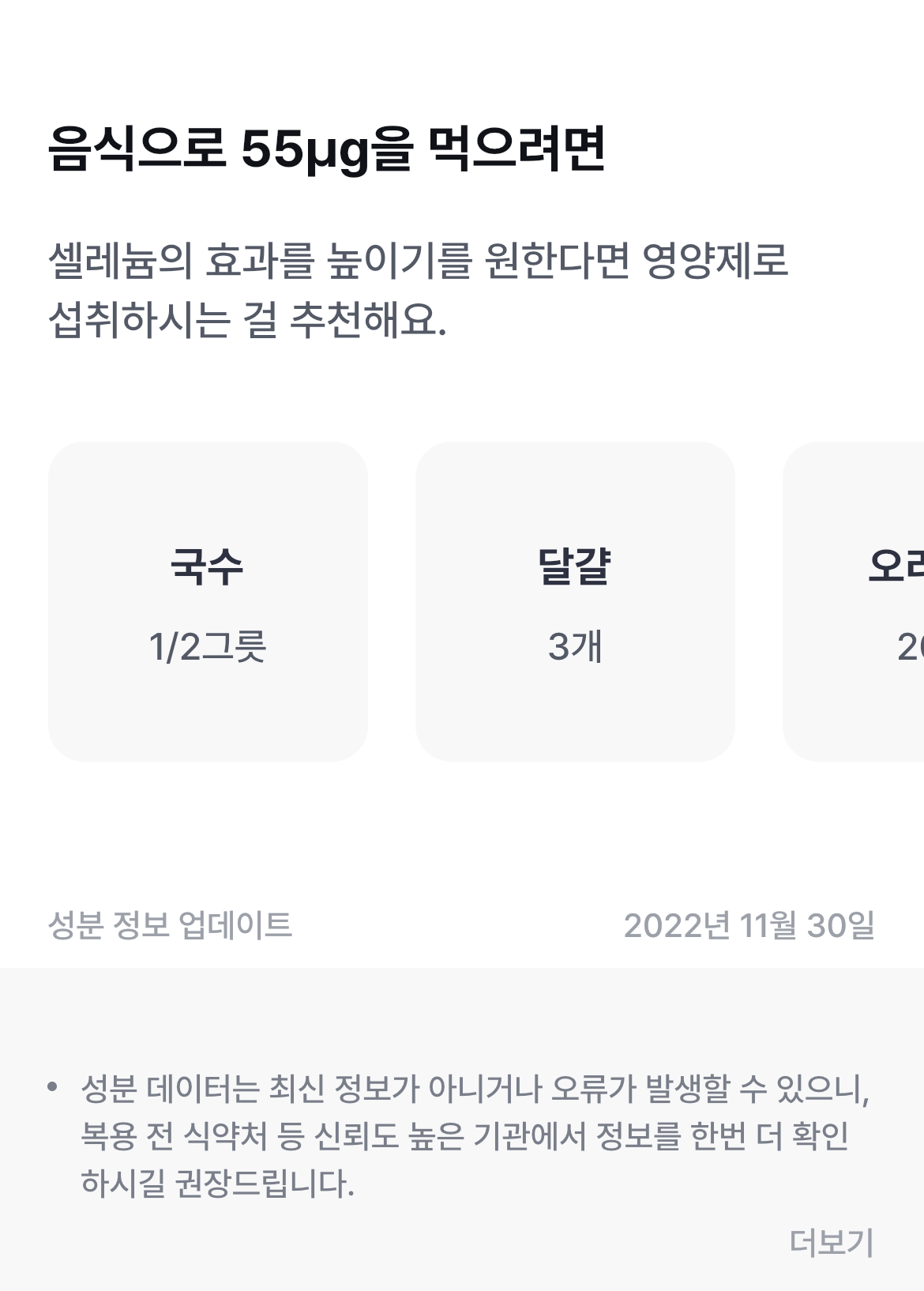 영양소마다 다르게 표기가 되는데, 어떤 영양제는 부족한 영양분을 음식으로 채울 경우 얼만큼의 음식이 필요한지도 예시로 보여주기도 합니다. 개인적으로 굉장히 맘에 드는 부분이었습니다. 부족한 영양소를 구지 모두 보충제로 채울 필요가 없을 뿐더러, 하루에 영양제를 제외하고도 많은 식품을 섭취하는데, 그 식품으로부터도 섭취할 수 있는 영양소들이 있기 때문에, 음식으로 알려주니 그 부분은 어느 정도 가늠해 볼 수 있어서 좋은 기능인 것 같습니다.