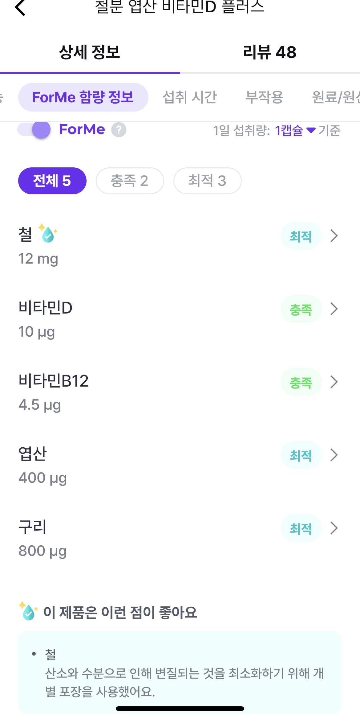 또한 영양소에 따라 권장 용량에 대한 설명이나, 섭취 시간대에 대한 조언 등이 포함되어 있기도 하고, 과다하게 복용했을 때 나타나는 부작용이나, 이 영양소 섭취량이 부족할 경우 일어날 수 있는 현상에 대해서도 설명이 포함되어 있어서, 자신의 상태를 비교해보기에 좋은 것 같습니다.