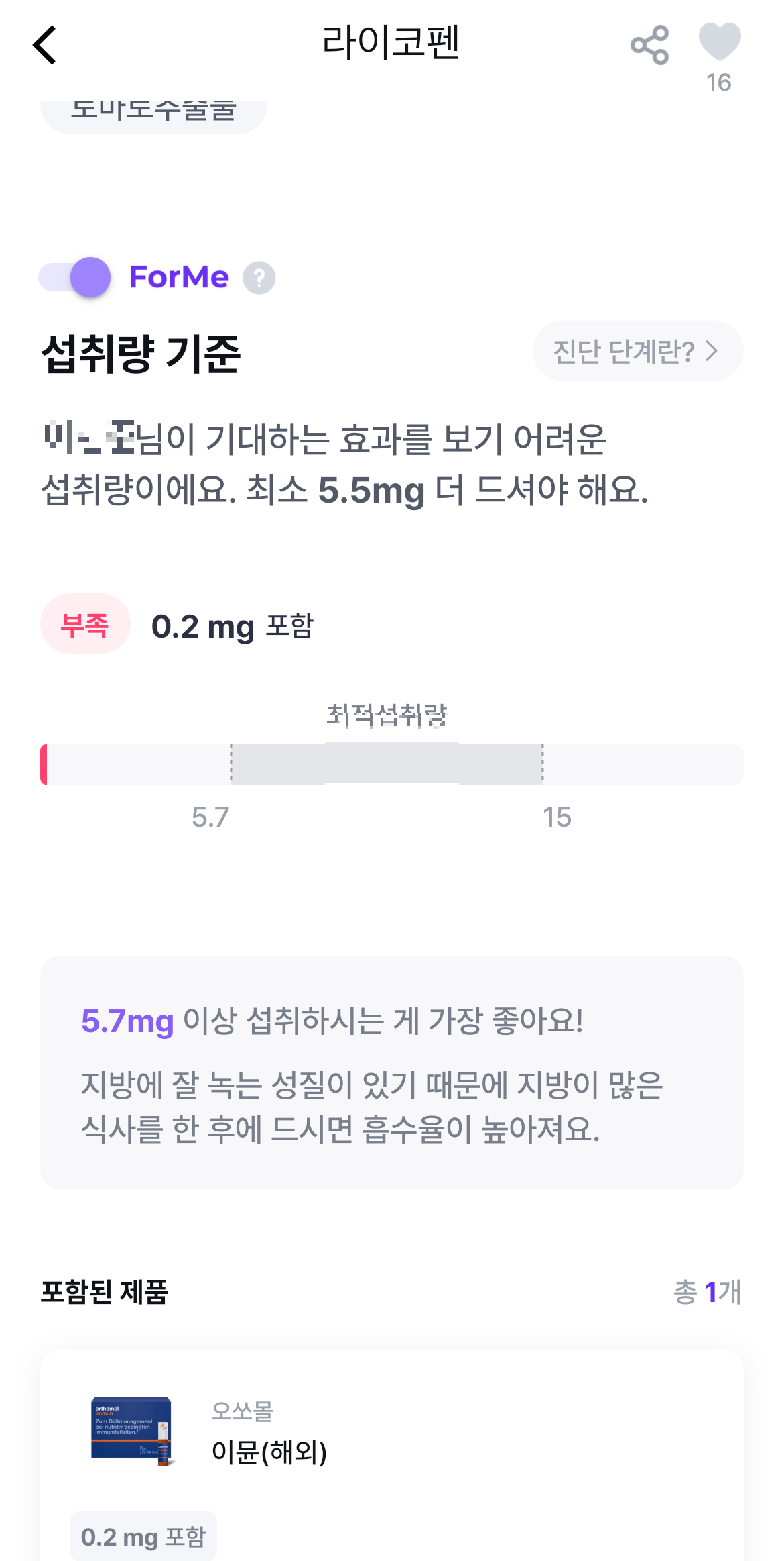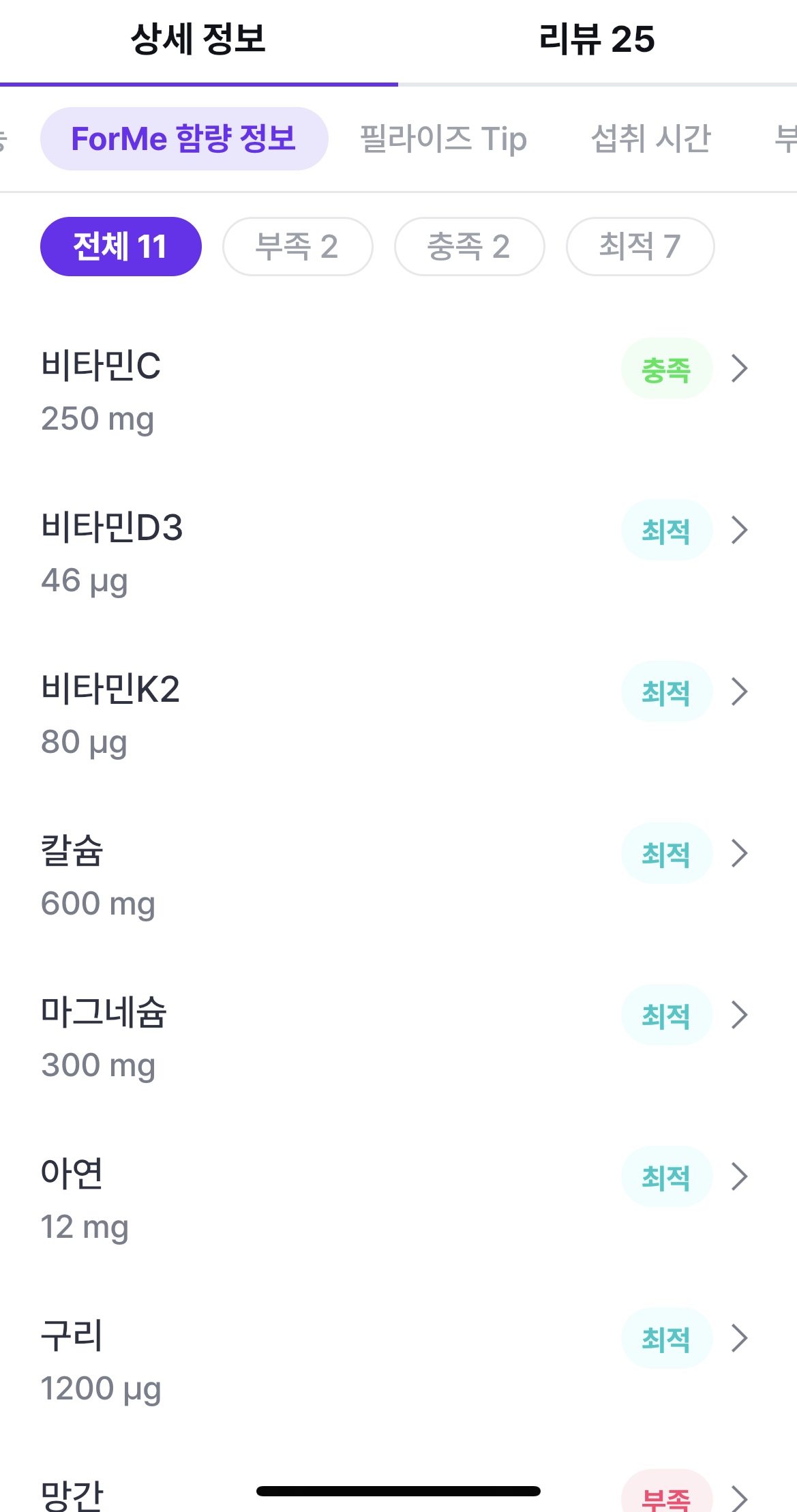 부족한 영양소를 한번 자세히 보도록 해보겠습니다. 부족 영양소를 최적섭취량이 표기되고, 부족한 부분을 볼 수 있습니다. 또한 현재 섭취하고 있는 제품에 이 부족한 영양소가 포함된 제품도 아래에 함께 보여줍니다.