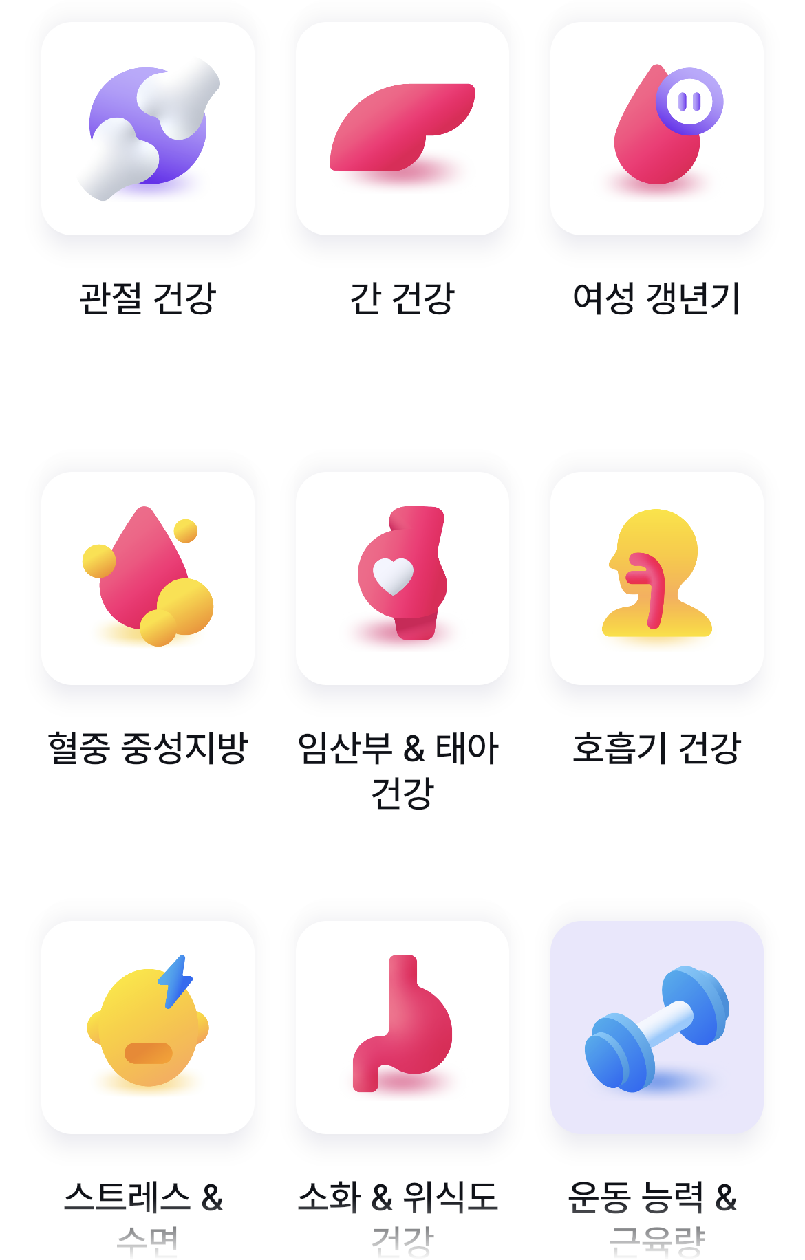 최대 8개까지 선택을 할 수 있고, 다양한 건강 고민에 대한 항목이 표시되어 있습니다. 총 27가지의 건강 고민 중에서 8개를 고를 수 있는데, 고르다 보니 8개가 모자란 느낌이 들더라구요. 또한 자신의 나이대에 맞춰서도 추천해 주기도 하니, 뭘 골라야할지 모를 때나 나의 나이대에는 어떤 고민들이 있을 수 있는지 참고할 수 있을 것 같습니다.