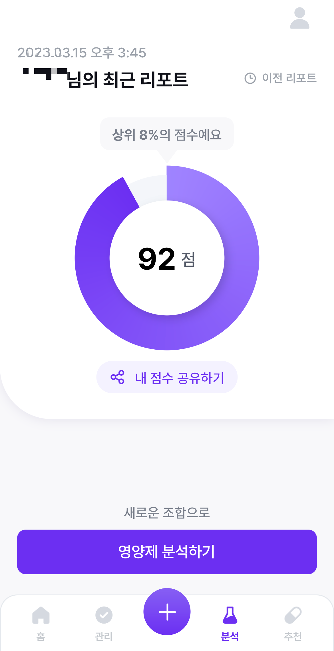 먼저 분석을 위해서 아래 "영양제 분석하기"를 눌러줍니다. 저는 이전에 제가 먹고 있는 영양제 조합을 분석해 보았기 때문에, 이전 접수가 떠 있습니다. 영양제 섭취가 때때로 변화하기 때문에, 새로운 영양제가 추가되거나, 빠졌을 때 새롭게 리포트를 분석하는 것을 추천드립니다.