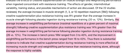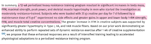 실제로 한 실험에서 크레아틴을 섭취한 그룹은 위약그룹보다 더 많은 무게를 들 수 있었고, 금육 섬유 단면적에서 유의한 증가를 보였습니다.
